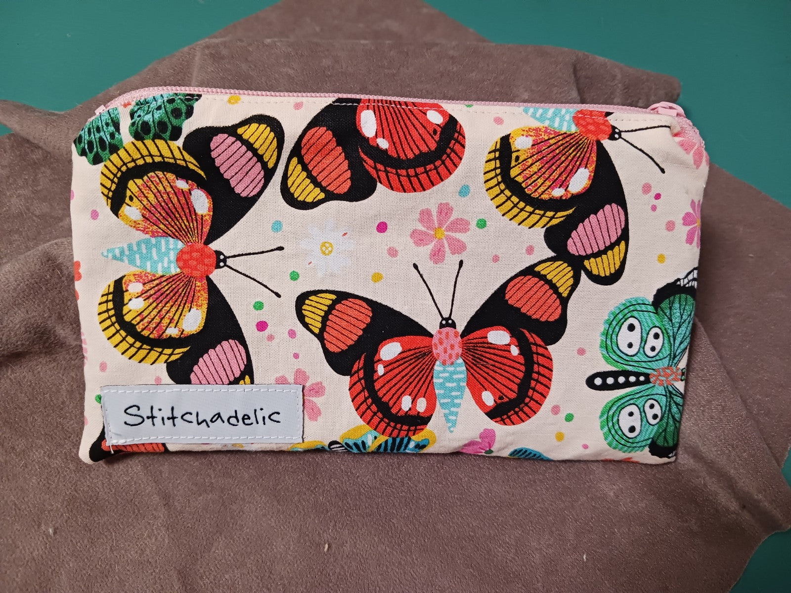 Ditty bag with butterflies on the outside, butterflies on the inside, and a pink zipper.