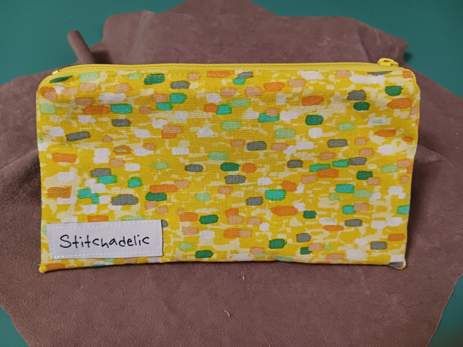 Ditty bag with color drops on the outside, rainbow shreds on the inside, and a yellow zipper.
