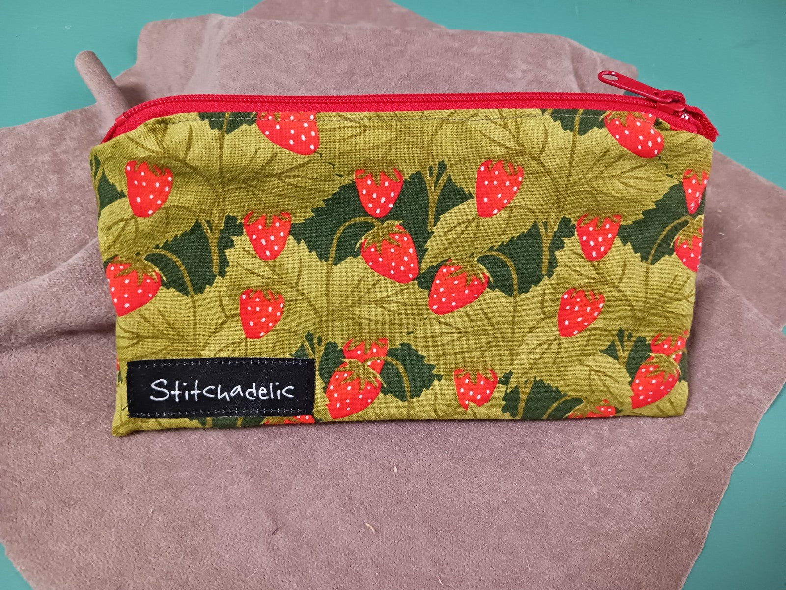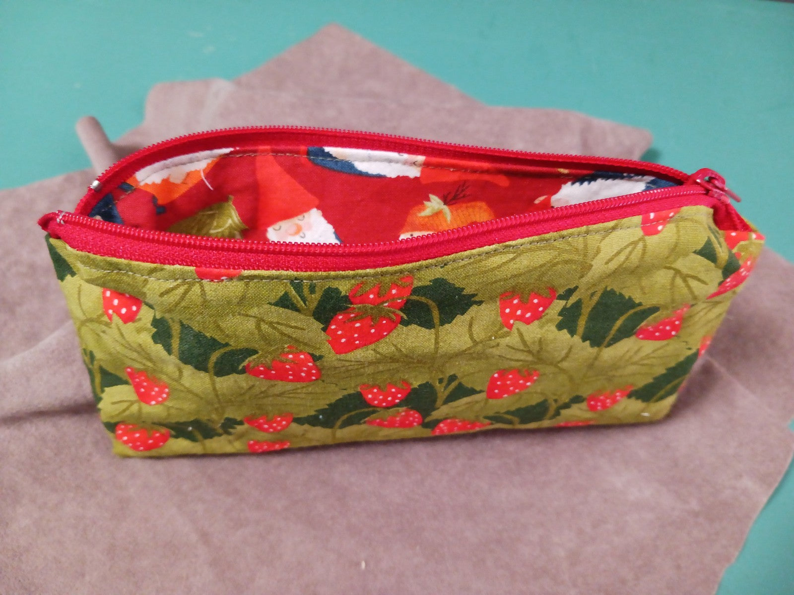 Ditty bag with a strawberry patch on the outside, gnomes on the inside, and a red zipper.